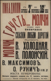 I. "Пикадилли", кинотеатр (Петроград).1. Холодная, Вера Васильевна (1893 - 1919) -- Афиши. 2. Полонский, Витольд Альфонсович (1879-1919) -- Афиши. 3. Максимов, Владимир Васильевич (1880-1937) -- Афиши. 4. Рунич, Осип Ильич (1889-1947) -- Афиши. 5. Народ (коллекция). 6. Россия в лицах (коллекция). 7. Год российского кино (коллекция). 8. "Сказка любви дорогой" (художественный фильм) -- Афиши. 9. "Молчи, грусть... молчи" (художественный фильм) -- Афиши. 10. Художественные фильмы -- Афиши. 11. Афиши. |