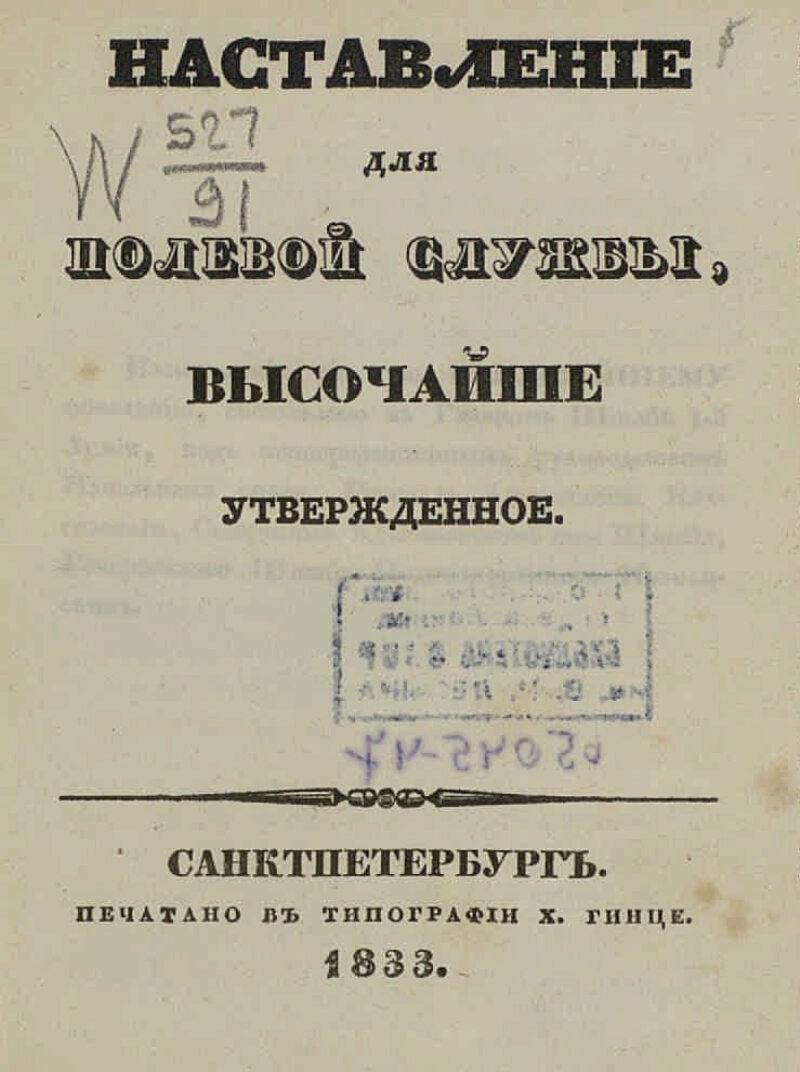 Наставление для полевой службы, высочайше утвержденные / [Сост. Ю. И. Познанский]. - Санктпетербург : тип. Гинце, 1833. - VII, 219 с. ; 12 см. - Сост. установлен по изд.: РБС. Плавильщиков - Примо. Спб., 1905, с. 267. - Последняя колонцифра 1-й паг. ошибочно: VIII