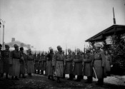 Николай II обходит роту почетного караула во время прибытия в Сарыкамыш [Изоматериал] : [фотография]. - Сарыкамыш, 1 декабря 1914. - Контактная печать со стеклянной фотопластины, черно-белая ; 18х24 см. - В свите Николая II: Н. П. Сабрин, П. К. Бенкендорф. Российский государственный архив кинофотодокументов. http://www.rgakfd.ru/.