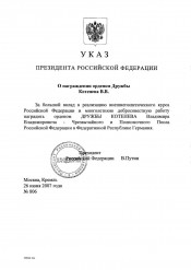 О награждении орденом Дружбы Котенева В. В. : Указ Президента Российской Федерации от 26 июня 2007 года № 806. - Москва, 2007. - 1 л. - Электронная копия