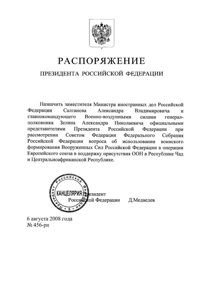 [О назначении заместителя Министра иностранных дел Российской Федерации Салтанова А.В. и главнокомандующего Военно-воздушными силами генерал-полковника Зелина А.Н. официальными представителями Президента Российской Федерации при рассмотрении Советом Федерации Федерального Собрания Российской Федерации вопроса об использовании воинского формирования Вооруженных Сил Российской Федерации в операции Европейского союза в поддержку присутствия ООН в Республике Чад и Центральноафриканской Республике] : Распоряжение Президента Российской Федерации от 6 августа 2008 года № 456-рп. - Москва, 2008. - 1 л. - Электронная копия