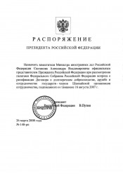 [О назначении заместителя Министра иностранных дел Российской Федерации Салтанова Александра Владимировича официальным представителем Президента Российской Федерации при рассмотрении палатами Федерального Собрания Российской Федерации вопроса о ратификации Договора о долгосрочном добрососедстве, дружбе и сотрудничестве государств - членов Шанхайской организации сотрудничества, подписанного в г. Бишкеке 16 августа 2007 г.] : Распоряжение Президента Российской Федерации от 26 марта 2008 года № 148-рп. - Москва, 2008. - 1 л. - Электронная копия