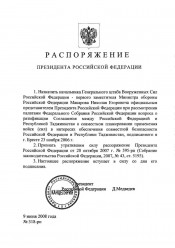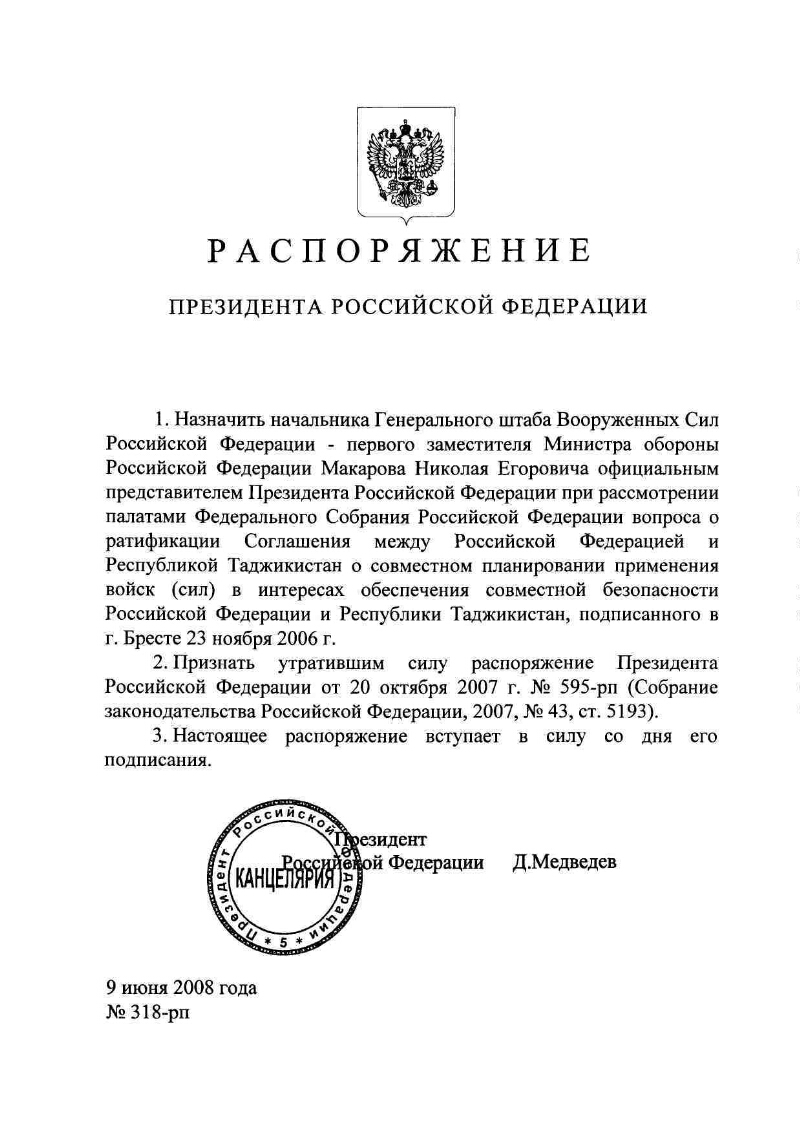 [О назначении начальника Генерального штаба Вооруженных Сил Российской Федерации - первого заместителя Министра обороны Российской Федерации Макарова Н.Е. официальным представителем Президента Российской Федерации при рассмотрении палатами Федерального Собрания Российской Федерации вопроса о ратификации Соглашения между Российской Федерацией и Республикой Таджикистан о совместном планировании применения войск (сил) в интересах обеспечения совместной безопасности Российской Федерации и Республики Таджикистан, подписанного в г. Бресте 23 ноября 2006 г.] : Распоряжение Президента Российской Федерации от 9 июня 2008 года № 318-рп. - Москва, 2008. - 1 л. - Электронная копия