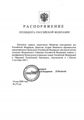 [О назначении первого заместителя Министра иностранных дел Российской Федерации Денисова А.И. официальным представителем Президента Российской Федерации при рассмотрении палатами Федерального Собрания Российской Федерации вопроса о ратификации Консульской конвенции между Российской Федерацией и Народной Республикой Бангладеш, подписанной в г. Москве 3 сентября 2007 г.] : Распоряжение Президента Российской Федерации от 19 мая 2008 года № 272-рп. - Москва, 2008. - 1 л. - Электронная копия