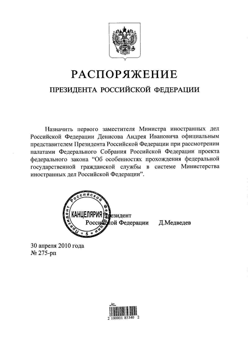 [О назначении первого заместителя Министра иностранных дел Российской Федерации Денисова А.И. официальным представителем Президента Российской Федерации при рассмотрении палатами Федерального Собрания Российской Федерации проекта федерального закона "Об особенностях прохождения федеральной государственной службы в системе Министерства иностранных дел Российской Федерации] : Распоряжение Президента Российской Федерации от 30 апреля 2010 года № 275-рп. - Москва, 2010. - 1 л. - Электронная копия .