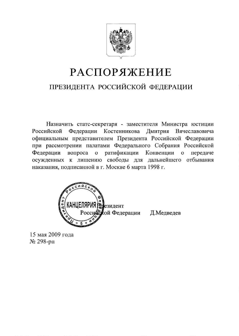 [О назначении статс-секретаря - заместителя Министра юстиции Российской Федерации Д. В. Костенникова официальным представителем Президента Российской Федерации при рассмотрении палатами Федерального Собрания Российской Федерации вопроса о ратификации Конвенции о передаче осужденных к лишению свободы для дальнейшего отбывания наказания, подписанного в г. Москве 6 марта 1998 г. ] : Распоряжение Президента Российской Федерации от 15 мая 2009 года № 298-рп. - Москва, 2009. - 1 л. - Электронная копия