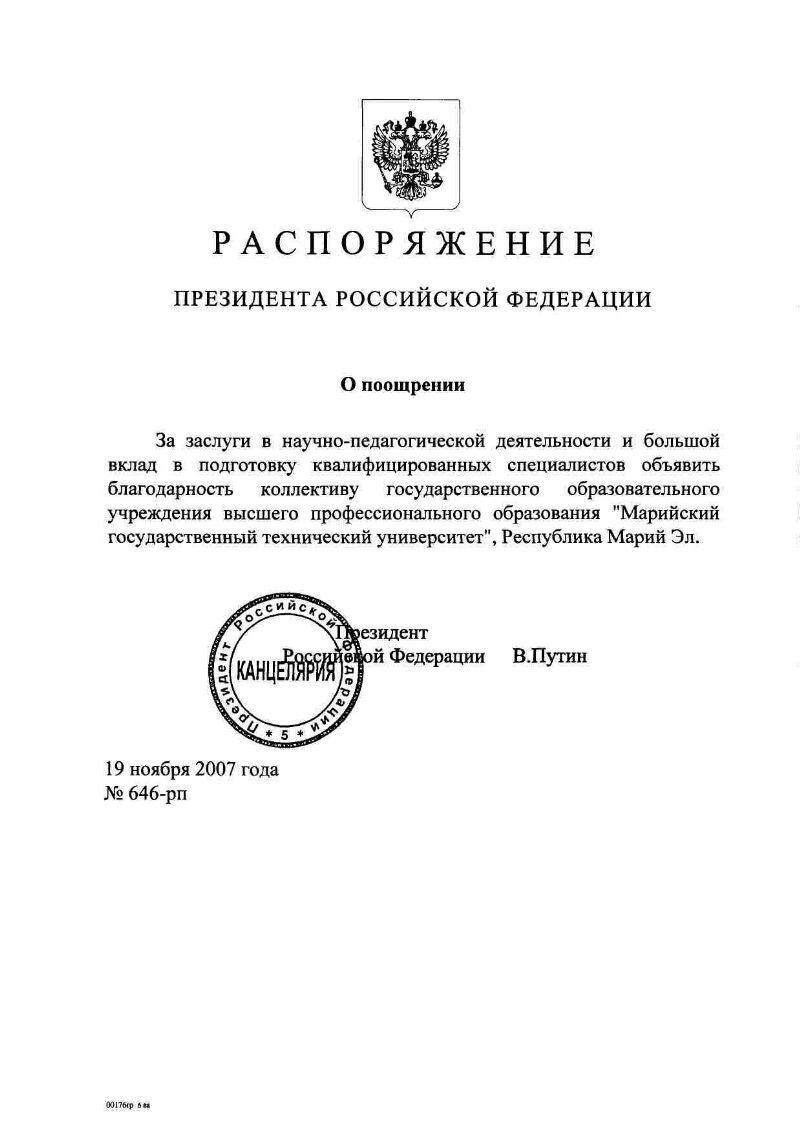 О поощрении : Распоряжение Президента Российской Федерации от 19 ноября 2007 года № 646-рп. - Москва, 2007. - 1 л. - Электронная копия