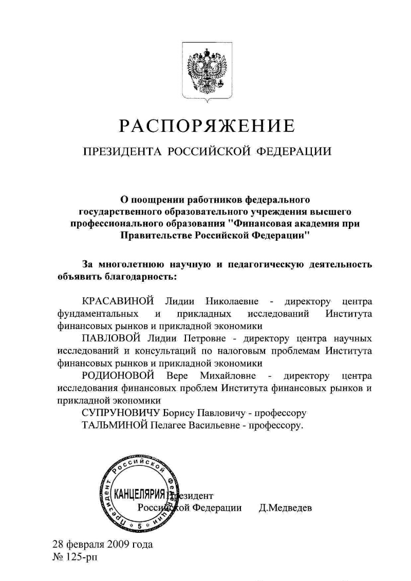 О поощрении работников федерального государственного образовательного учреждения высшего профессионального образования "Финансовая академия при Правительстве Российской Федерации" : Распоряжение Президента Российской Федерации от 28 февраля 2009 года № 125-рп. - Москва, 2008. - 1 л. - Электронная копия