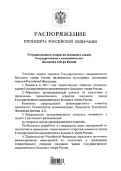 О торжественном открытии основного здания Государственного академического Большого театра России : Распоряжение Президента Российской Федерации от 29 октября 2010 года № 716-рп. - Москва, 2010. -2 л.. - Электронная копия.