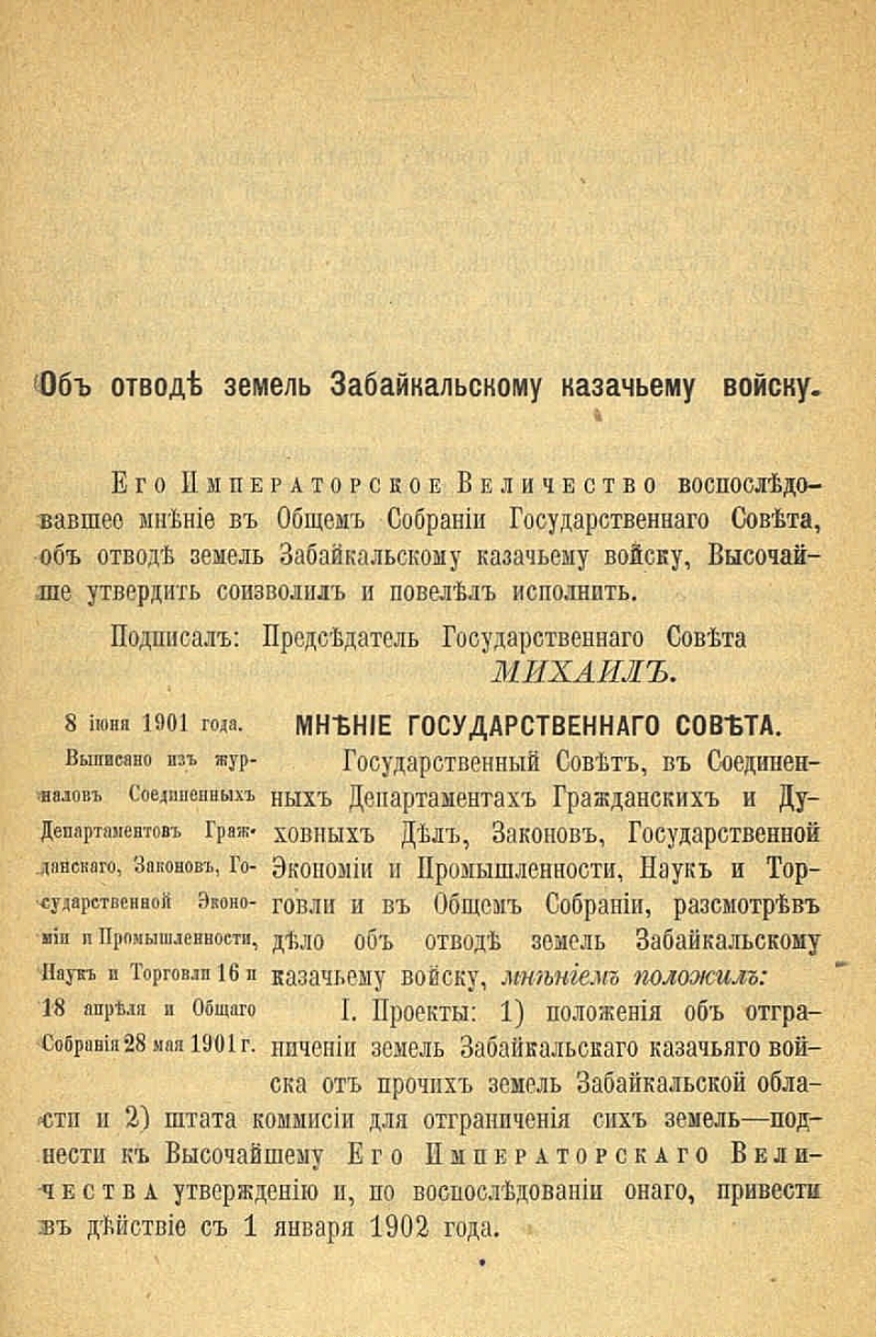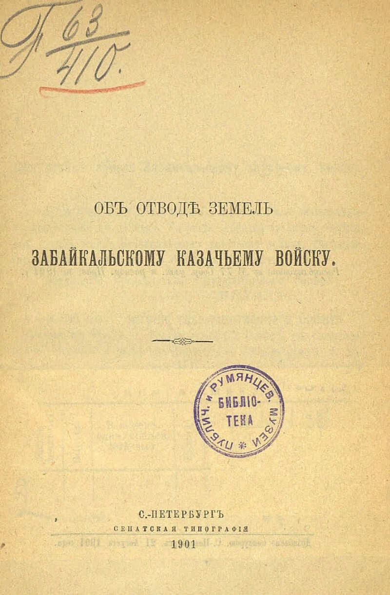 Об отводе земель Забайкальскому казачьему войску. - С.-Петербург : Сенат. тип., 1901. - 24 с. ; 18 см .