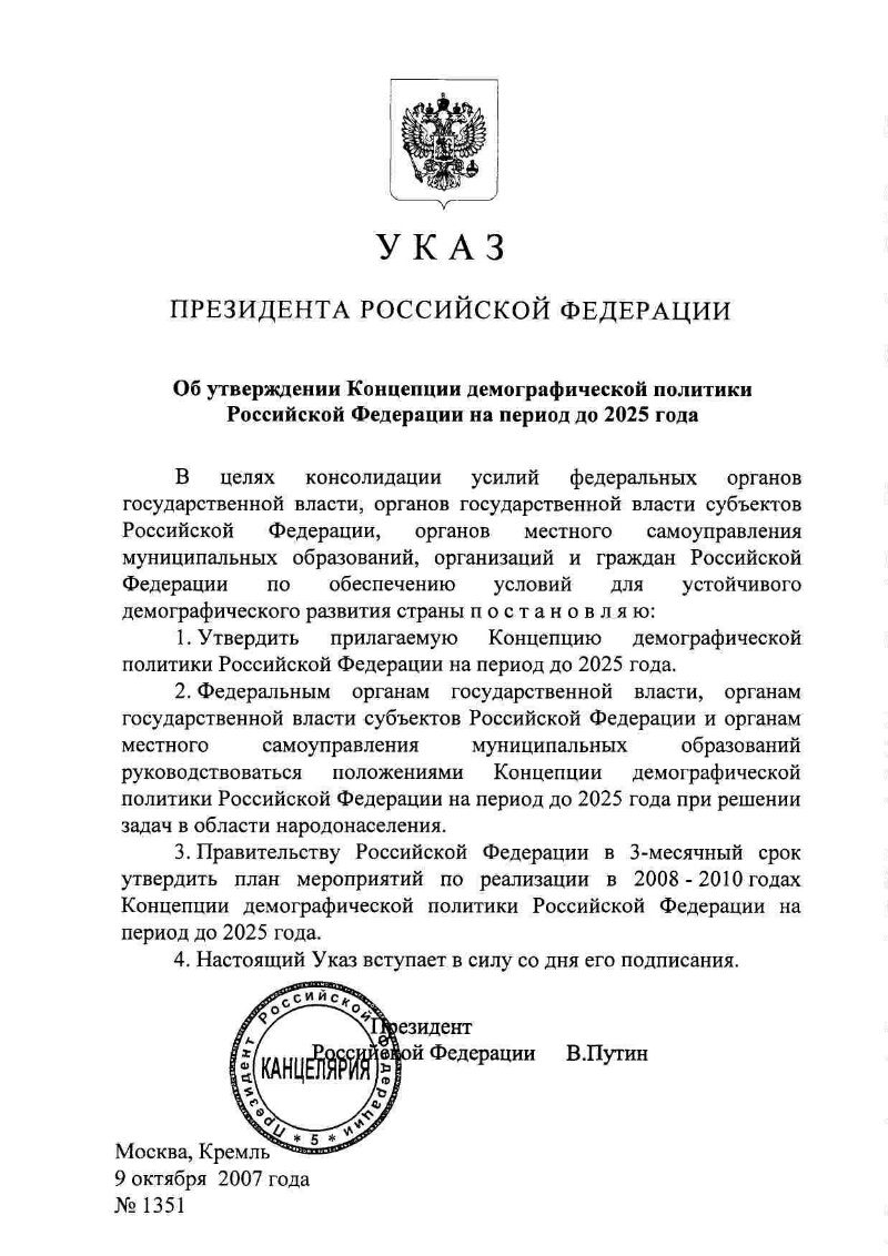Об утверждении Концепции демографической политики Российской Федерации на период до 2025 года : Указ Президента Российской Федерации от 9 октября 2007 года № 1351. - Москва, 2007. - 1, 16 л. - Концепция демографической политики Российской Федерации на период до 2025 года (16 л.). - Электронная копия