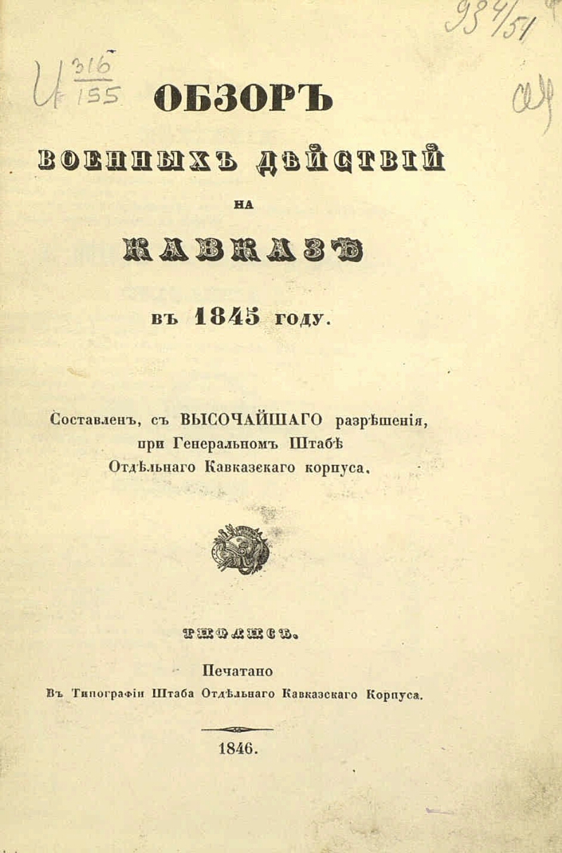 Описание Обзор военных действий на Кавказе в 1845 году : составлено при Генеральном штабе Отдельного Кавказского корпуса. - Тифлис : тип. Штаба Отд. кавк. корпуса, 1846. - 113 с. ; 21 см . ББК 63.3(2)521-69,1 Источник копии: РГБМесто хранения оригинала: РГБ Издательство тип. Штаба Отд. кавк. корпуса Объект в каталогах Россия в 1 пол. XIX в.