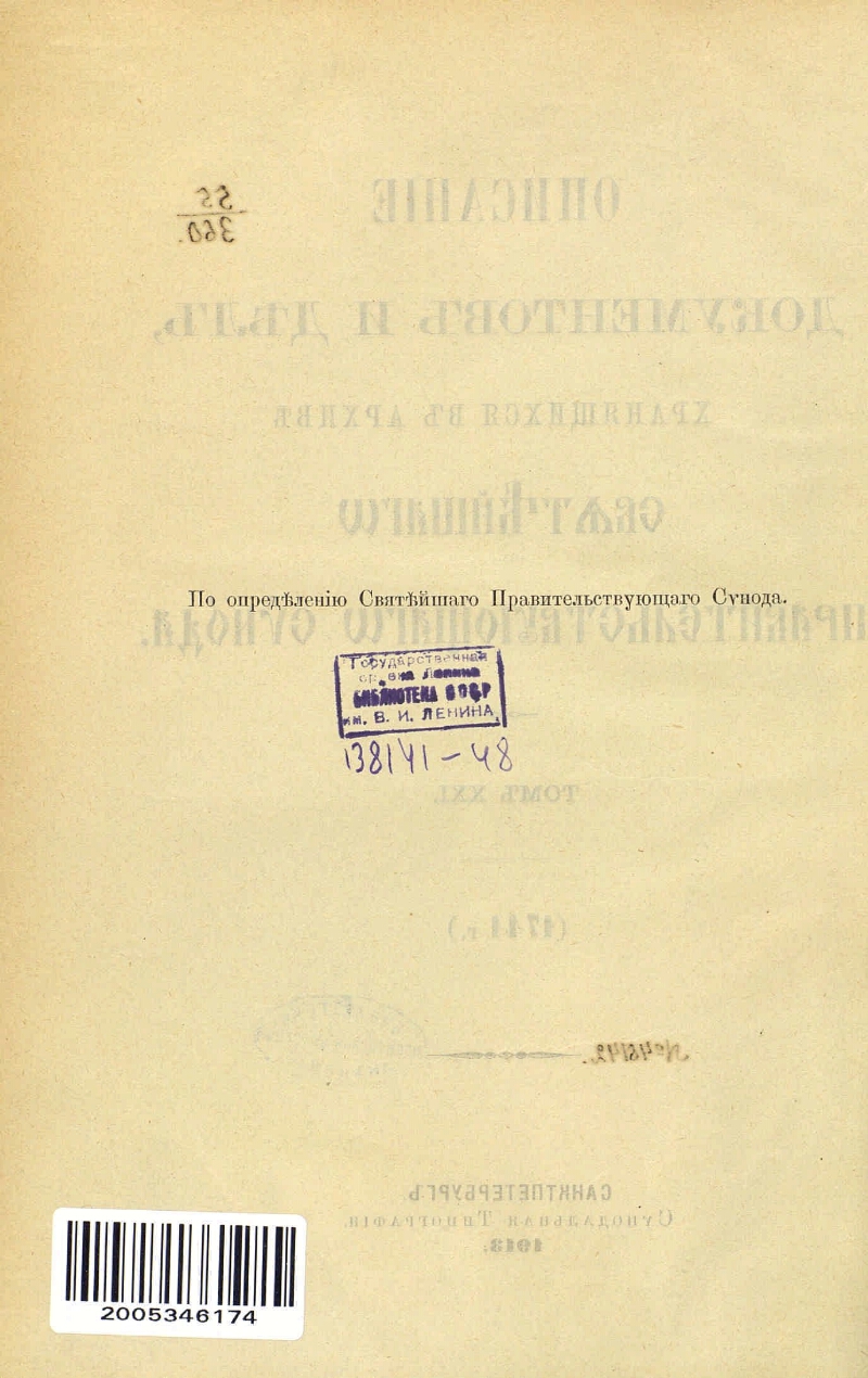 Описание документов и дел, хранящихся в архиве Святейшего правительствующего синода / [составлено Комиссией для разбора и описания архива Святейшего правительствующего синода]. - Санктпетербург : Синодальная типография, 1868-1914. - 29 см. - Тома 13, 17, 24-25, 27, 30, 33, 35-38, 40-49 не были изданы.