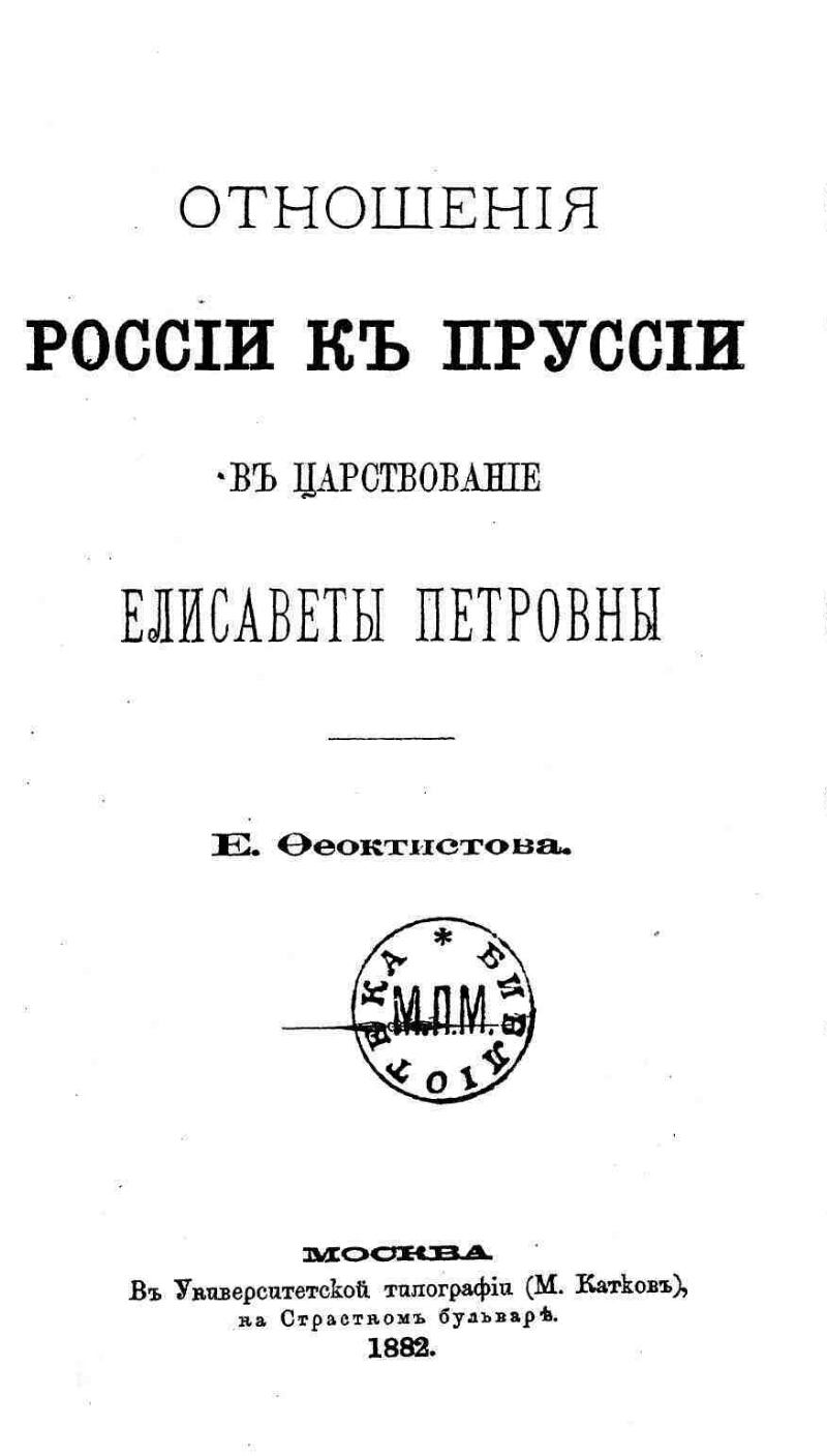 Отношения России к Пруссии в царствование Елизаветы Петровны / [сочинение] Е. Феоктистова. - Москва : В Университетской типографии, 1882. -204 с. ; 21 см. - Библиография в подстрочных примечаниях.