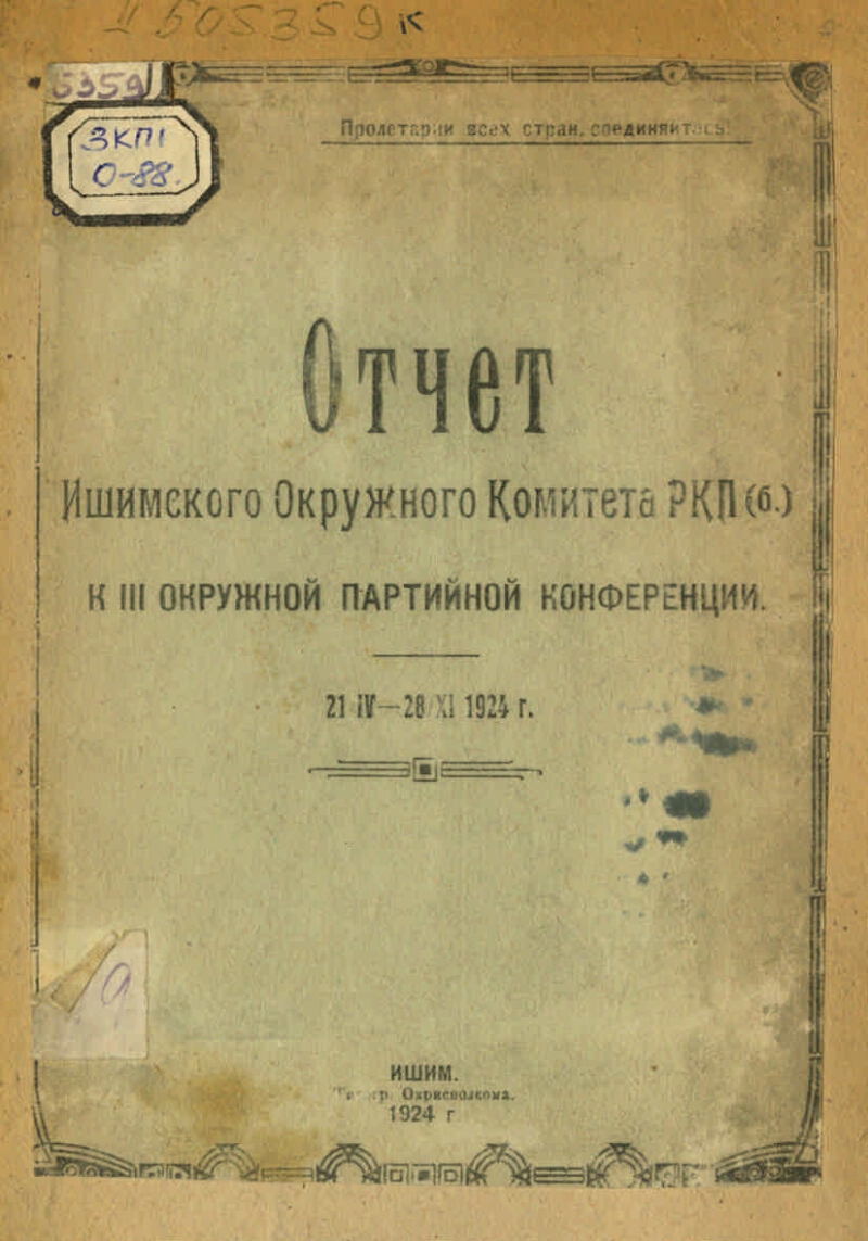 Отчет Ишимского окружного комитета РКП(б.) к III Окружной партийной конференции : 21/IV - 28/XI 1924 г. - Ишим : Тип. Окрисполкома, 1924. - 10, 21, 9, 7, 8, 23 с. : табл. - В кн. также: Отчет Ишимского окружного комитета Р.Л.К.С.М. : (за период с 1-го мая по 25-е ноября 1924 г.)