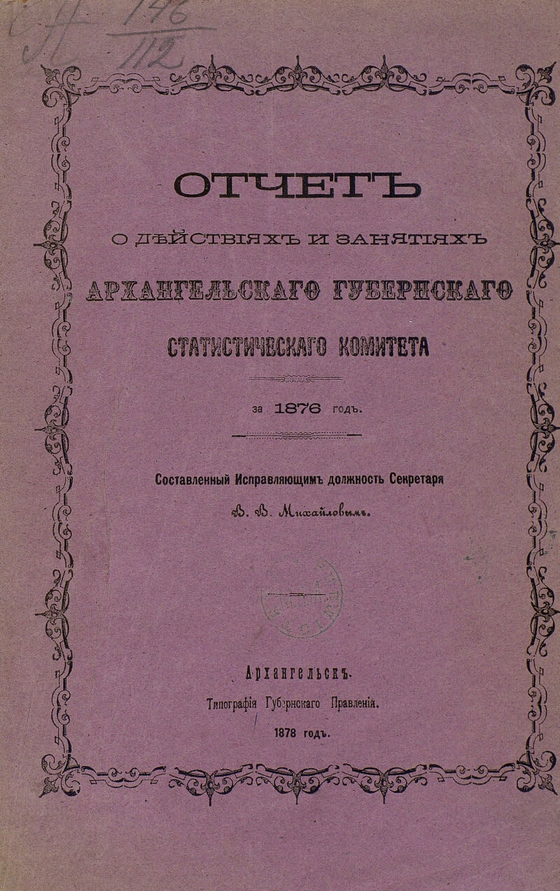за 1876 г. / сост. В. В. Михайловым. - 1878. - 221 с. разд. паг. - Загл.: Отчет о действиях и занятиях Архангельского губернского статистического комитета ...