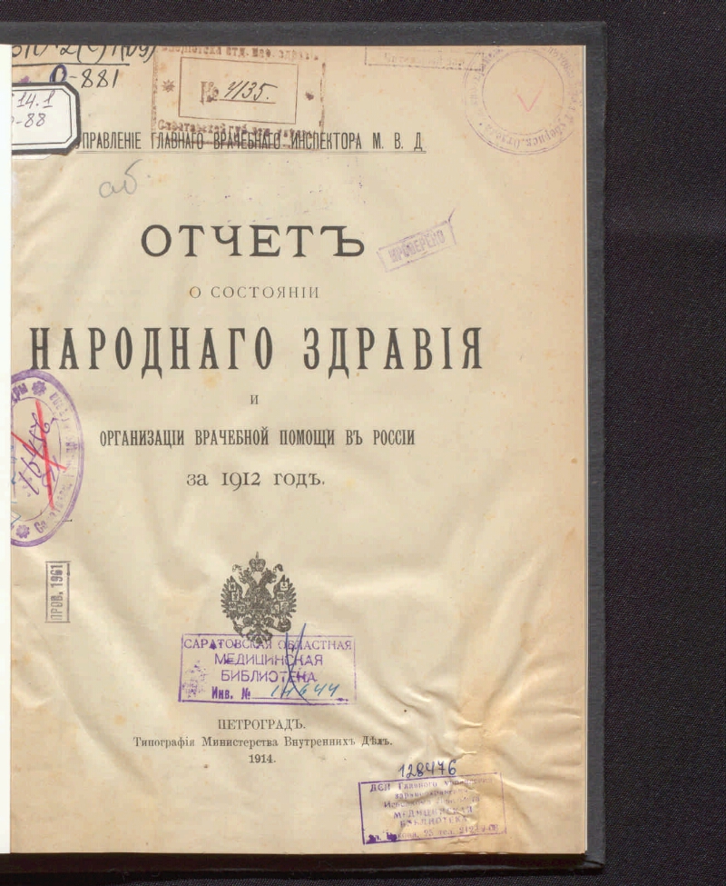 Отчет о состоянии народного здравия и организации врачебной помощи в России... / Управление главного врачебного инспектора МВД. - Санкт-Петербург, 1856-1916. - 25 см. - Заглавия отчетов: за 1855, 1856, 1858-59 гг. Отчет о состоянии общественного здравия и деятельности больниц гражданского ведомства в Империи; за 1876-80, 1888-86 гг. Отчет Медицинского департамента; за 1881-82, 1887-95 гг. Отчет Медицинского департамента Министерства внутренних дел; за 1902 г. Отчет о состоянии народного здравия и организации врачебной помощи населению в России. Подзаголовок отчетов: за 1856, 1858-59 гг. С числительною ведомостию болезней, пользованных в гражданских больницах, по губерниям. Составлен Медицинским департаментом из поступивших в оный официальных сведений; за 1902 г. Составлен Управлением главного врачебного инспектора Министерства внутренних дел; за 1855, 1857 составлен Медицинским департаментом из поступивших в оный официальных сведений. Надзаголовок отчетов за 1855-59, 1876-1895, 1902 гг. не указан.