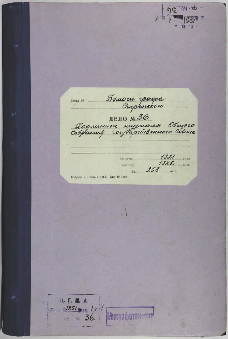 Подлинные журналы Общего собрания Государственного Совета [Дело] : 1821-1822 гг. - 1821-1822. -259 л.. - (Фонд Бумаги М. М. Сперанского. Опись № 1, часть 1)