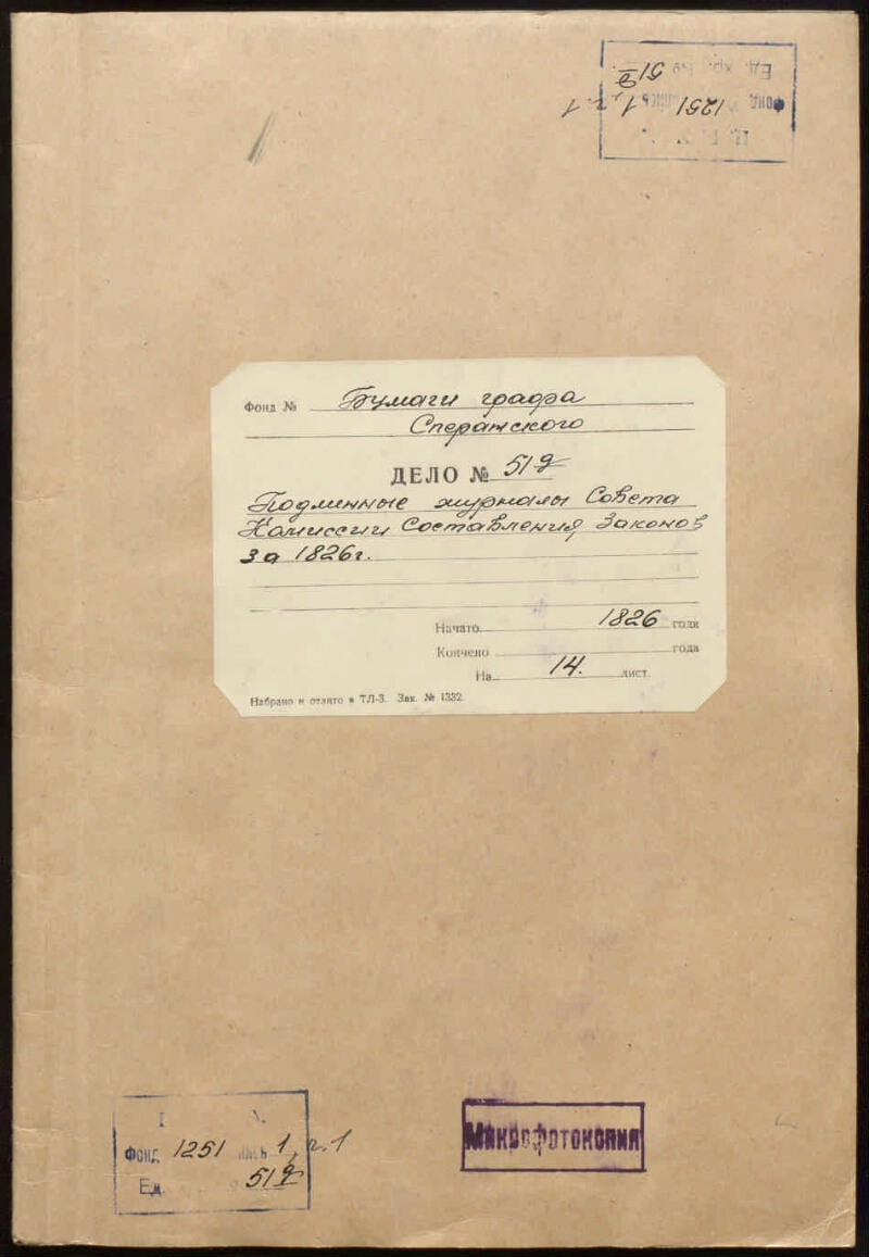 Подлинные журналы Совета Комиссии Составления Законов за 1826 год (январь и февраль) [д)] [Дело]. - 1826. -14 л.. - (Фонд Бумаги М. М. Сперанского. Опись № 1, часть 1)