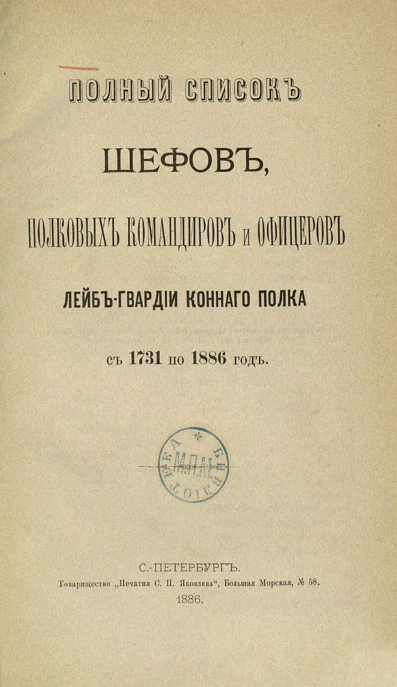 Описание Конный лейб-гвардии полк Полный список шефов, полковых командиров и офицеров Лейб-гвардии конного полка с 1731 по 1886 год. - С.-Петербург, 1886. - 510, 18 с. ; 24 см . ББК 68.41(2) Источник копии: РГБМесто хранения оригинала: РГБ Объект в каталогах Вооруженные силы в целом В коллекциях Государственные праздники России: история и современность → День Героев Отечества – 9 декабря → История праздника → Защита Отечества: на фронте и в тылу → Вооружённые силы → Коллекции → Русская императорская армия → Рода войск и службы → Гвардейский корпус → Кавалерия → История отдельных полков → Лейб-гвардии конный полк