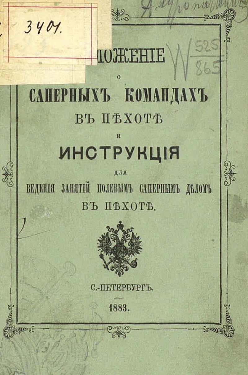 Положение о саперных командах в пехоте и инструкция для ведения занятий полевым саперным делом в пехоте. - С.-Петербург : В Воен. тип., 1883. - [2], 20 с. ; 14 см. - В конце текста: помощник Е. И. В. председателя Глав. ком. по устройству и образованию войск ...