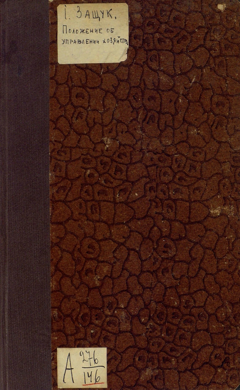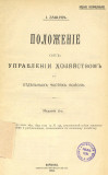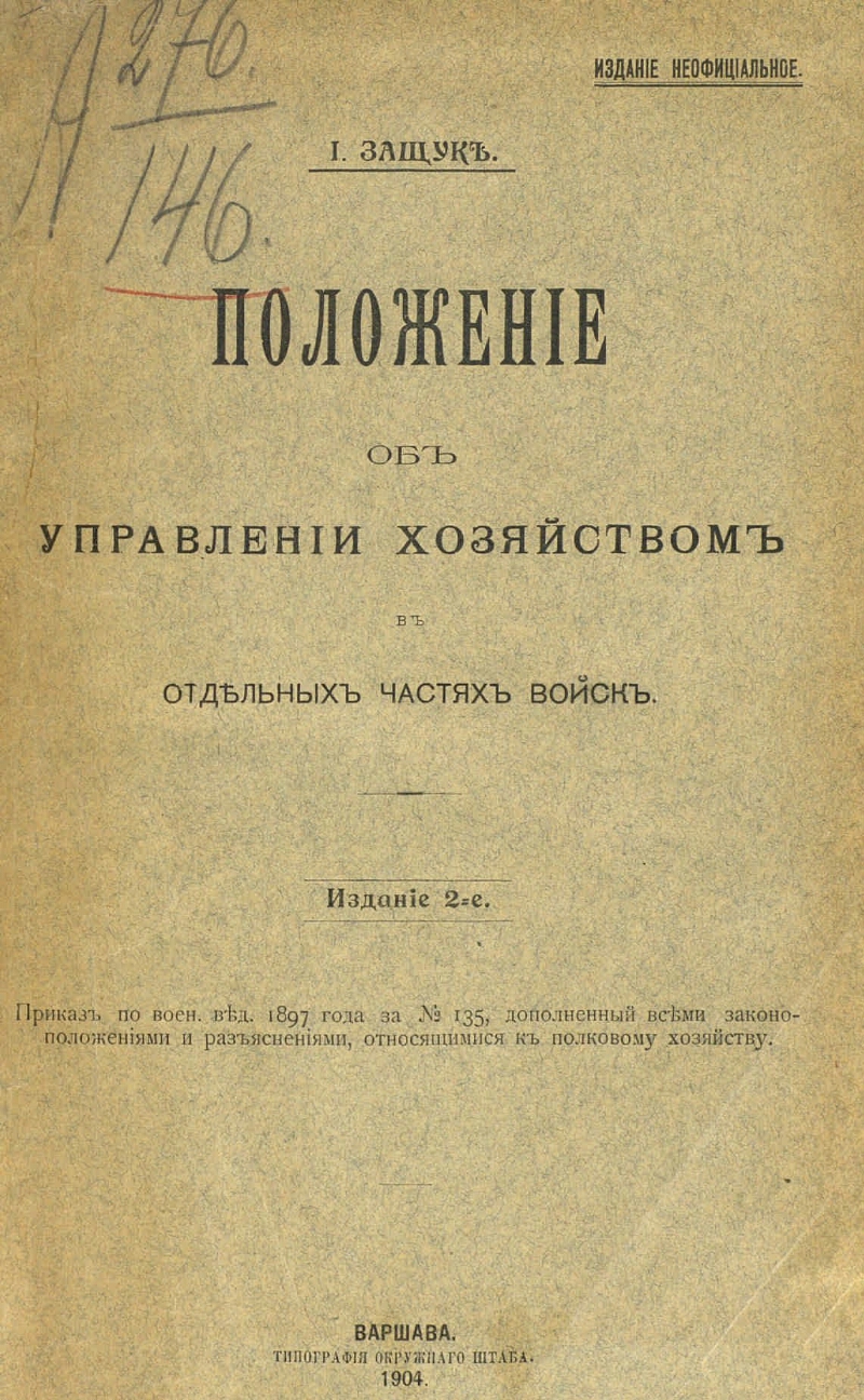 Положение об управлении хозяйством в отдельных частях войск : Приказ по Воен. вед. 1897 г. за № 135, дополненный всеми законоположениями и разъяснениями, относящимися к полковому хозяйству / И. Защук. - Изд. 2-е. - Варшава : тип. Окр. штаба, 1904. - II, 192 с. ; 26 см
