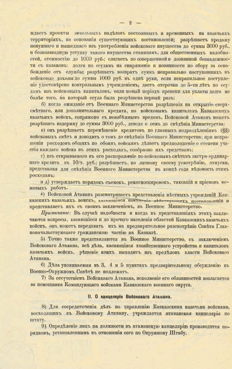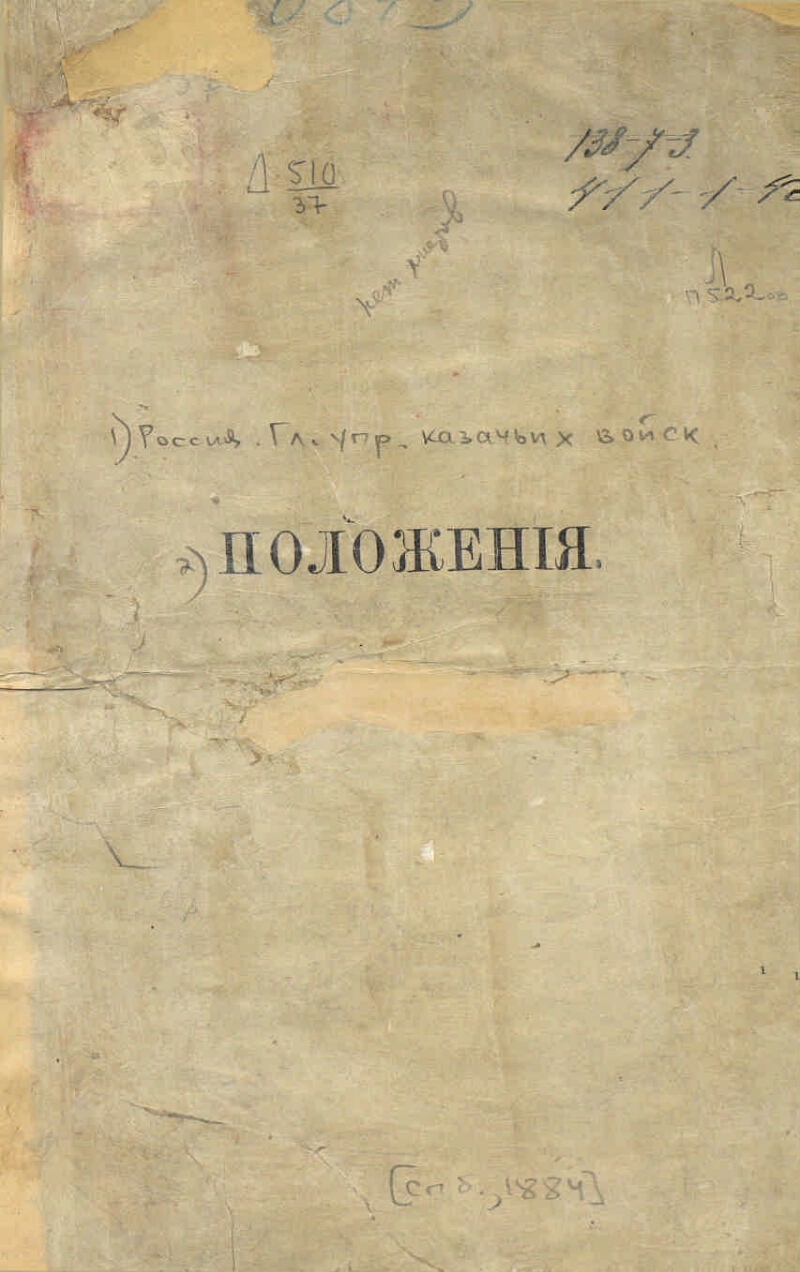 Положения. - [Санкт-Петербург : Тип. А. Траншеля, 1884]. - 32 с. разд. паг. - Содерж.: Проект 1. О войсковом атамане кавказских казачьих войск 2. О канцелярии войскового атамана; Проект положения о местном управлении областей кавказских казачьих войск и о войсковых правлениях; Наказ войсковым правлениям областей кавказских казачьих войск; Проект. Инструкция для внутреннего порядка производства дел в войсковых правлениях областей кавказских казачьих войск; Проект. Положение об управлении отделами Кубанского и Терского казачьих войск