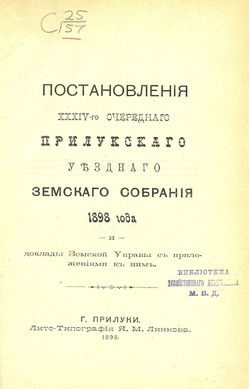 XXXIV-го очередного ... 1898 года. - Прилуки : Лито-тип. Я. М. Линкова, 1898. - 521 с. - Печать: Библиотека хозяйственного департамента М. В. Д.