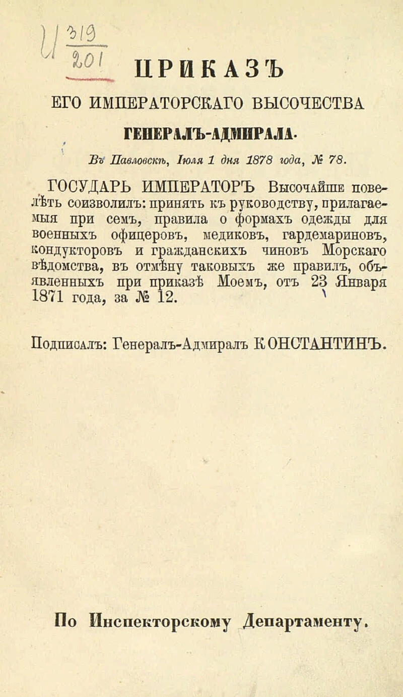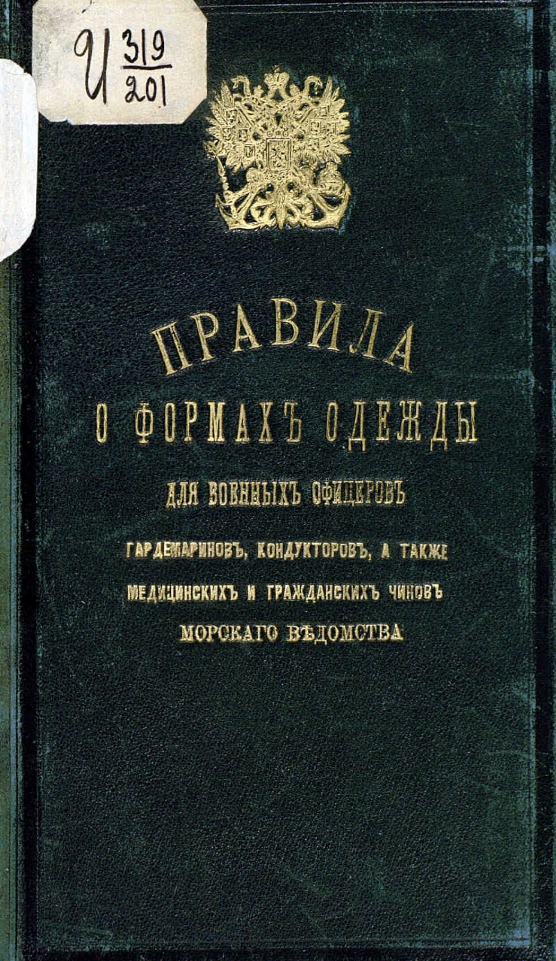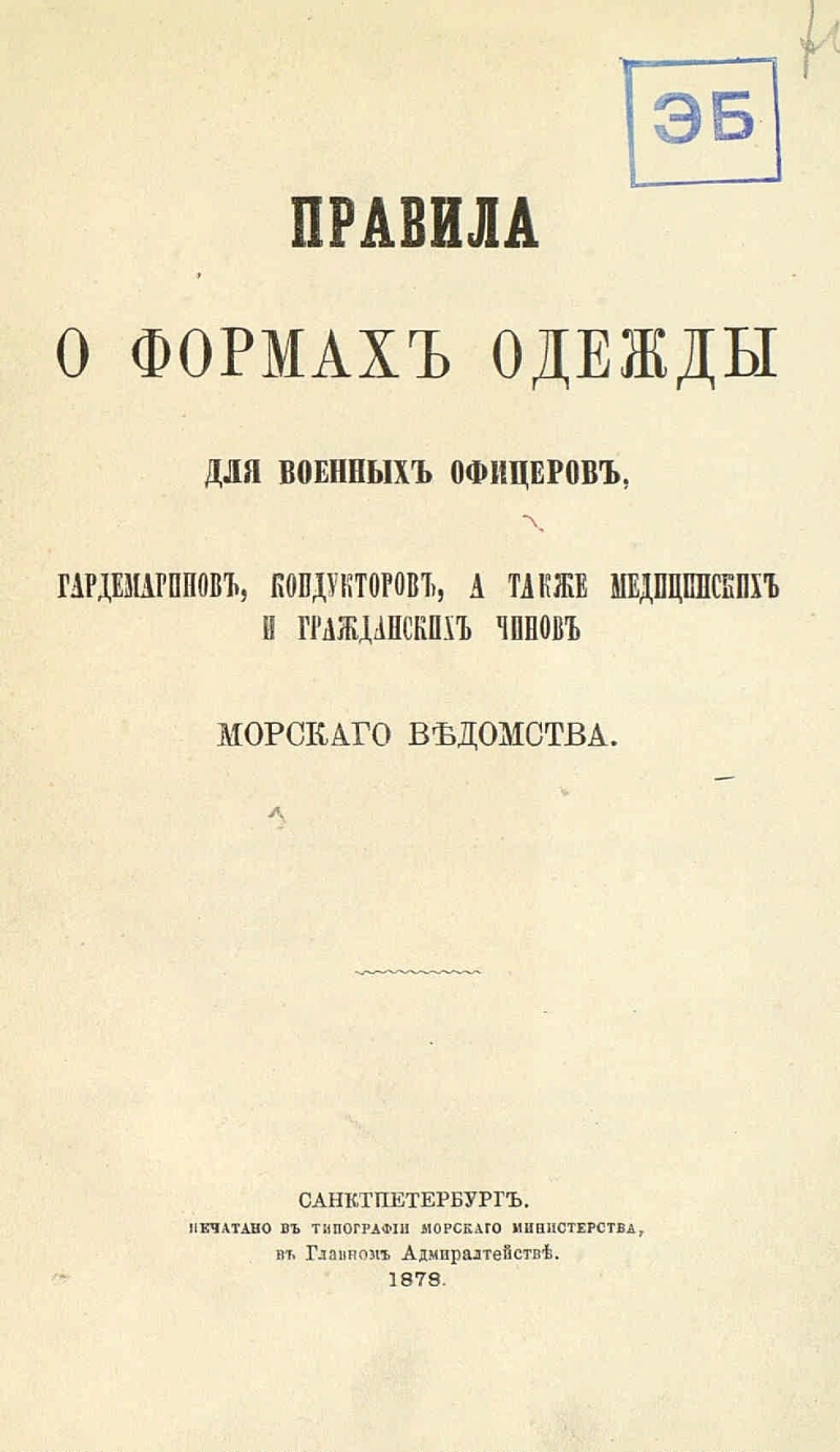 Правила о формах одежды для военных офицеров, гардемаринов, кондукторов, а также медицинских и гражданских чинов морского ведомства. - Санктпетербург, 1878. - [3], II, 51 с. ; 23 см