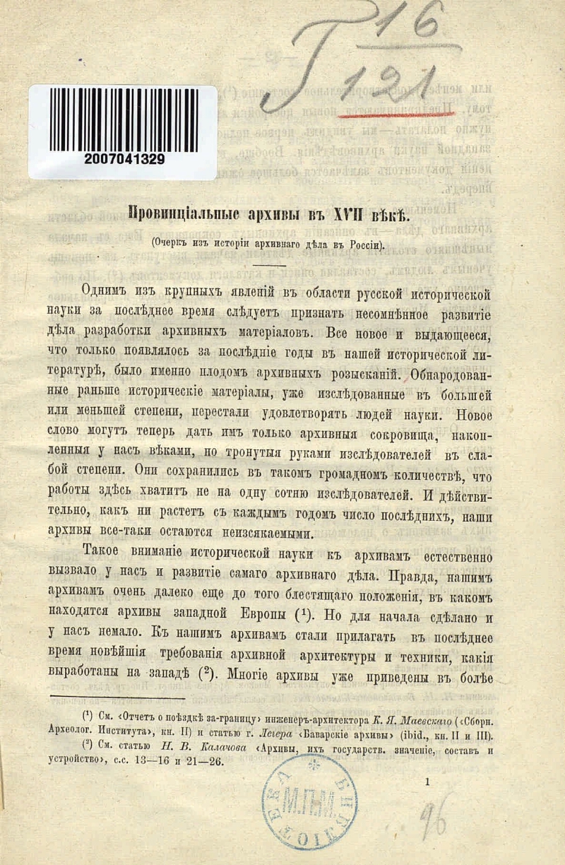Провинциальные архивы в XVII веке : (Очерк из истории архивного дела в России) / [Действ. чл. Н. Оглоблин]. - [Санкт-Петербург : тип. В. Безобразова и К°, 1886]. - 133 с. ; 26 см. - Напеч. также в: Сб. ст. по архивоведению. Т. 1. Спб., 1910 Без тит. л. и обл. Библиогр. в примеч. - Авт. указан в конце текста. - В конце кн. ошибочно: Отд. отпеч. из "Сборника Археол. ин-та"