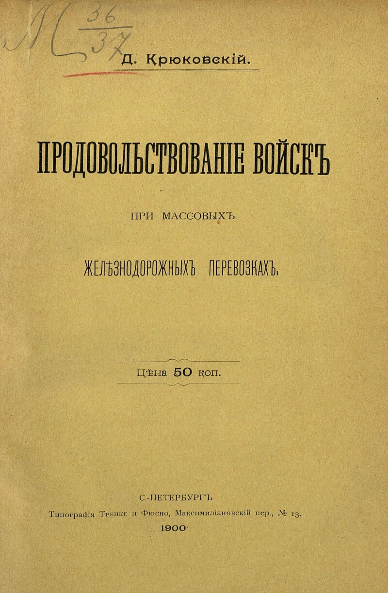 Автор Крюковский Дмитрий Иванович Описание Крюковский, Дмитрий Иванович Продовольствование войск при массовых железнодорожных перевозках / Д. Крюковский. - С.-Петербург : Тип. Тренке и Фюсно, 1900. - [2], 51 с., 8 л. черт. ; 25 см . ББК 68.724.3ББК 68.41(2) Источник копии: РГБМесто хранения оригинала: РГБ Издательство тип. Тренке и Фюсно Объект в каталогах Тыл Вооруженных Сил Вооруженные силы в целом В коллекциях Государственные праздники России: история и современность → День Героев Отечества – 9 декабря → История праздника → Защита Отечества: на фронте и в тылу → Вооружённые силы → Коллекции → Русская императорская армия → Интендантская служба → Тарифы, раскладки, ведомости