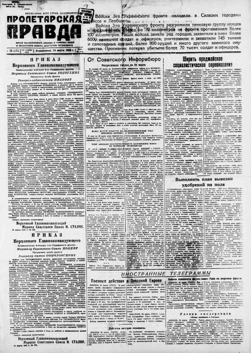 1945, № 58 (7726) (25 марта). - 2 с.