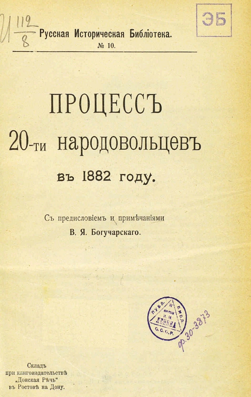 Процесс 20-ти народовольцев в 1882 году / С предисл. и примеч. В. Я. Богучарского. - Ростов на Дону : электро-печатня А.И. Тер-Абрамиан, 1906. - 122 с. ; 25 см. - (Русская историческая библиотека ; № 10 ) .