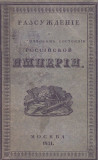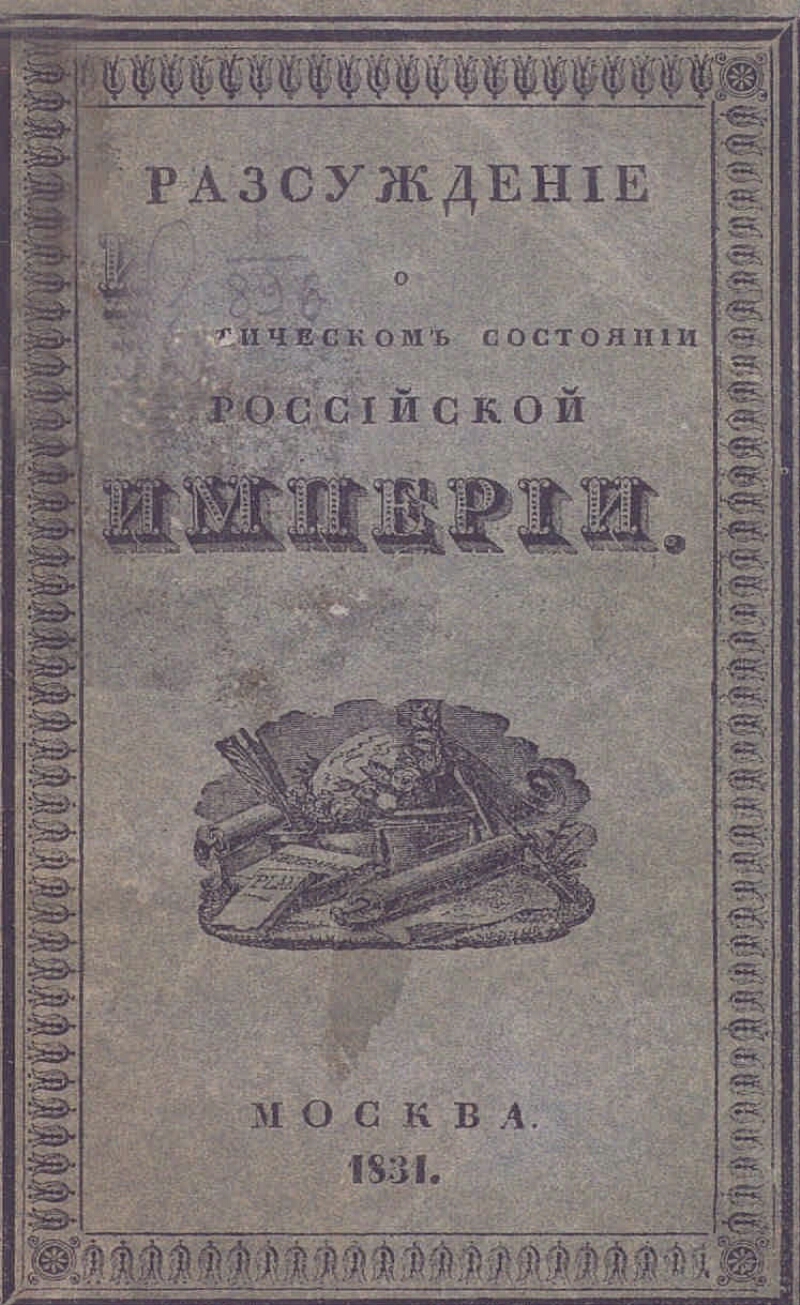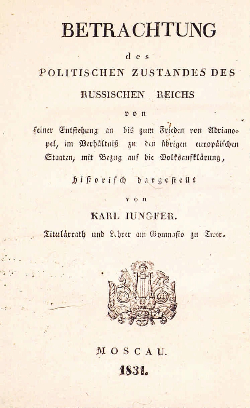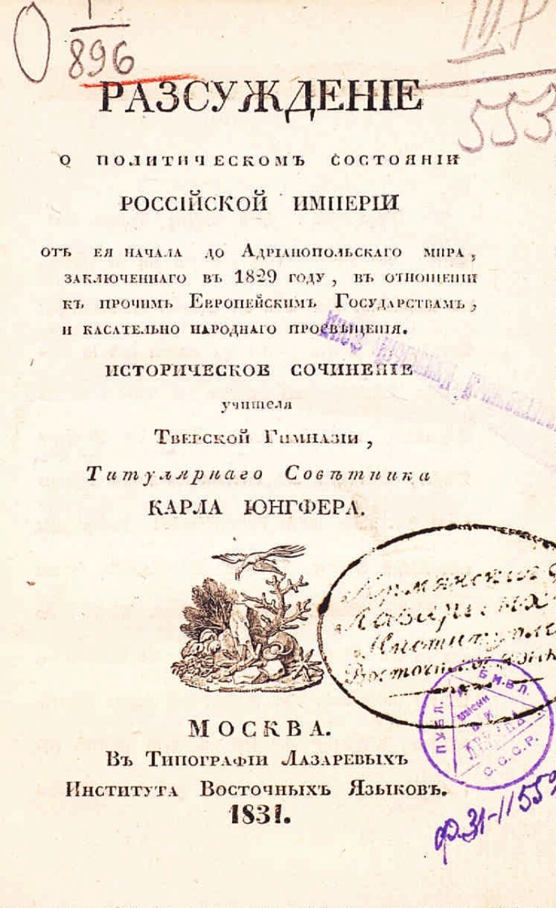 Рассуждение о политическом состоянии Российской империи от ее начала до Адрианопольского мира, заключенного в 1829 году, в отношении к прочим Европейским государствам, и касательно народного просвещения / ист. соч. учителя Твер. гимназии... Карла Юнгфера. - Москва : тип. Лазаревых ин-та вост. яз., 1831. - 116 с. ; 17 см. - Парал. тит. л. на нем. яз.; текст парал. на рус. и нем. яз.