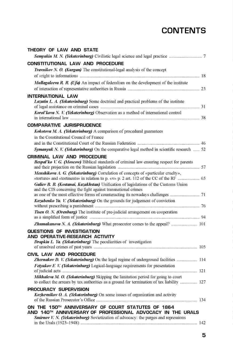 2014, № 4 (97). - 2014. - 236, [4] с. - Содержит статьи: Обеспечение процессуальных гарантий в Конституционном совете Франции в сравнении с Конституционным Судом РФ / М. А. Кокотова. Советизация адвокатуры: чистки и репрессии на Урале (1923 - 1948 гг.) / В. Н. Смирнов. Отечественный механизм правового регулирования торговлей спиртными напитками в условиях акцизной системы их обложения: к вопросу об эффективности алкогольной политики Александра III / Г. А. Жолобова. М. М. Сперанский: концептуальные подходы к систематизации российского законодательства / С. В. Кодан. М. М. Сперанский и систематизация законодательства: из творческого наследия / [публикация подготовлена С. В. Коданом], и другие материалы. - Библиография в подстрочных примечаниях.
