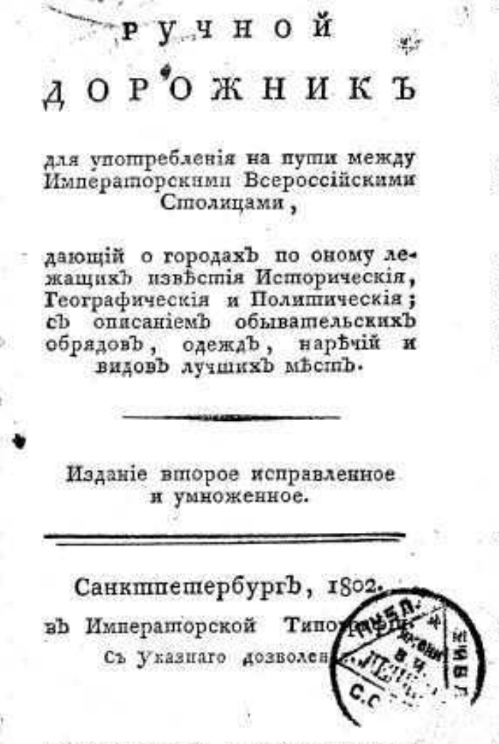Ручной дорожник для употребления на пути между императорскими всероссийскими столицами, дающий о городах по оному лежащих известия историческия, географическия и политическия : С описанием обывательских обрядов, одежд, наречий и видов лучших мест. - Издание второе исправленное и умноженное. - Санктпетербург : В Императорской типографии, 1802. - 188 с., [5] л. ил., [1] л. табл. ; 16° (12 см). - Виды Великого Новгорода, Бронницкой горы, Вышнего Волочка, Торжка, Твери. - Грав. резцом С.Ф. Галактионов. - В подстроч. примеч. авт. приводятся сведения ист. характера. - Ценз.: С указнаго дозволения. - Посвящение авт. имп. Елизавете Алексеевне (с. 3 - 8) с подписью: Иван Глушков. Августа 15 дня 1801 года. - Сводный каталог русской книги 1801-1825 гг.