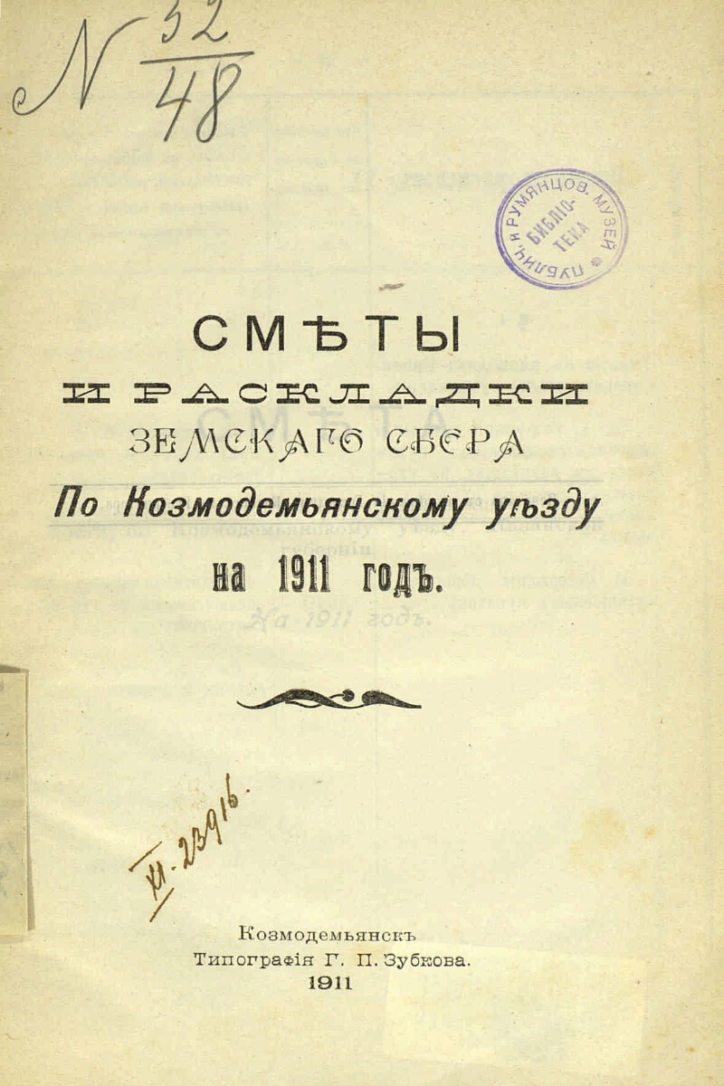 Описание Козьмодемьянская уездная земская управа Сметы и раскладки земского сбора по Козмодемьянскому уезду... . - Козмодемьянск , [1867]-1915 . - 23 см на 1910 год. - 1911. - 265 с. . ББК 63.3(2)533-334 Источник копии: РГБМесто хранения оригинала: РГБ Издательство Тип. Г. П. Зубкова Объект в каталогах Россия в период 1907-1914 гг. В коллекциях Государика → Территория России → Коллекции → Регионы России → Республика Марий Эл: страницы истории → Все материалы коллекции → Территория → Экономика. Экономическая география → Налоги и сборы