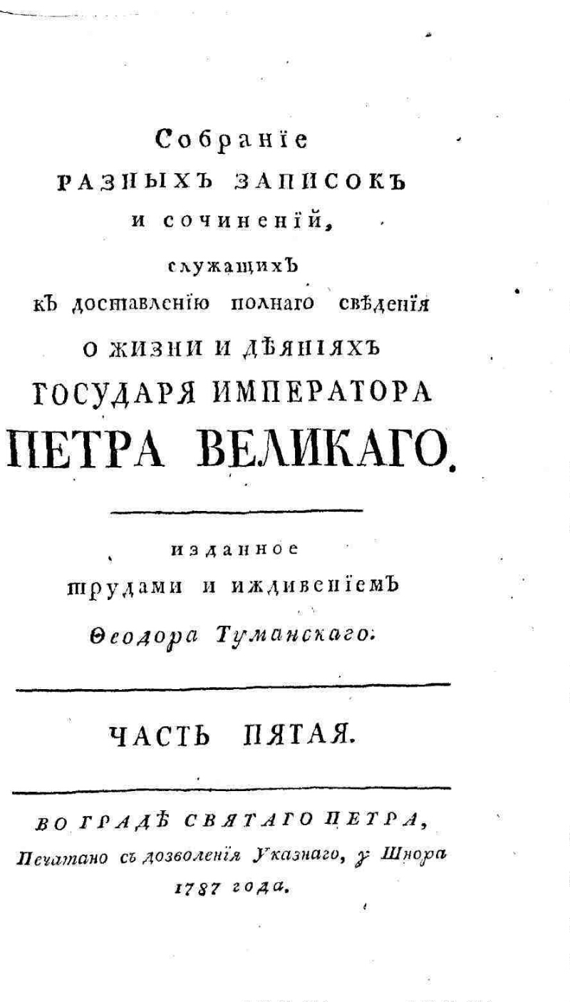 Собрание разных записок и сочинений, служащих к доставлению полнаго сведения о жизни и деяниях государя императора Петра Великаго / Изданное трудами и иждивением Феодора Туманскаго. - Во граде святаго Петра : печатано у Шнора, 1787-1788. - 8°. - Помещенное в ч. 1 сообщение "О состоянии Российския империи в 1699 году, с англинскаго" является переводом двух писем из книги, изданной J. Crull в Лондоне в 1699 г.: The Present condition of the Muscovite empire, till the year 1699. In two letters... В русском переводе вся эта книга ошибочно приписана J. Bouvet. Имеется также гравированный титульный лист: Жизнь и деяния государя императора Петра Великаго. Во граде святаго Петра. Соч. Феодор Туманский.