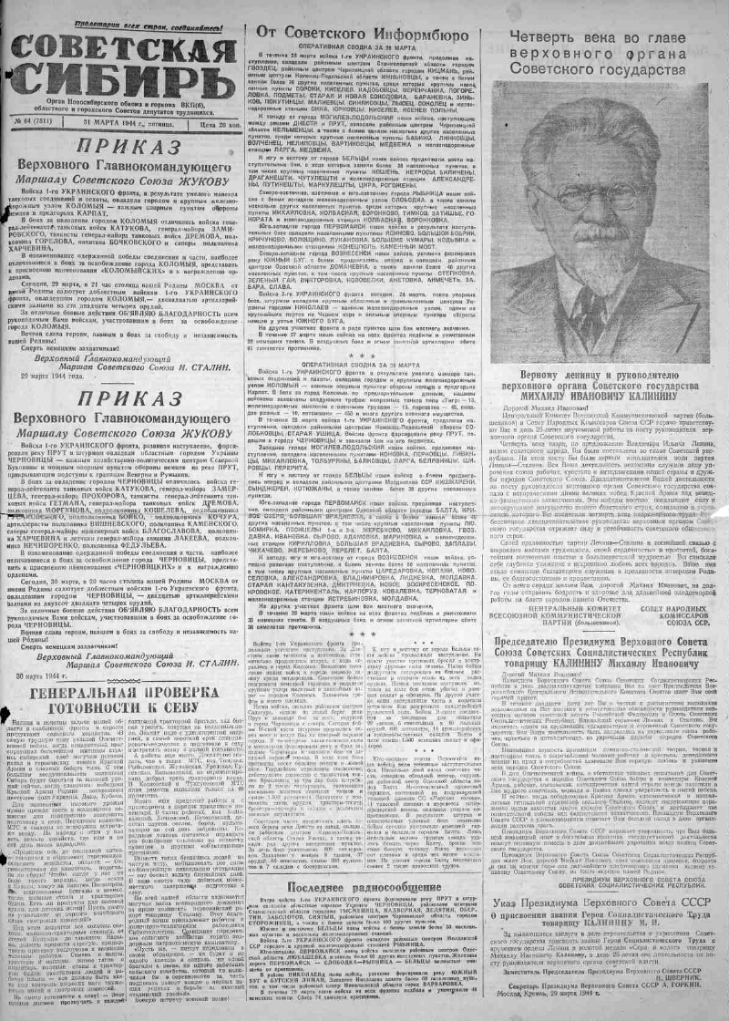 1944, № 64 (7511) (31 март.). - 2 с.