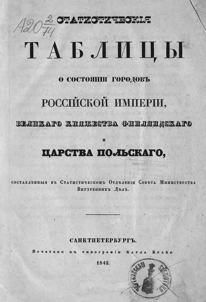 Статистические таблицы о состоянии городов Российской империи, Великого княжества Финляндского и Царства Польского, составленные в Статистическом отделении Совета Министерства внутренних дел. - Санкт-Петербург : тип. Карла Крайя, 1842. - [3], 76 с., 3 л. табл. ; 28