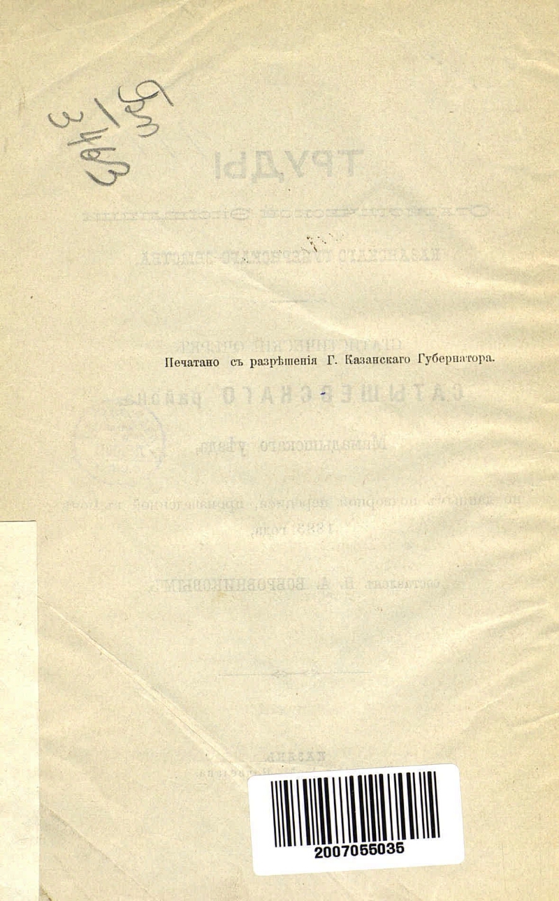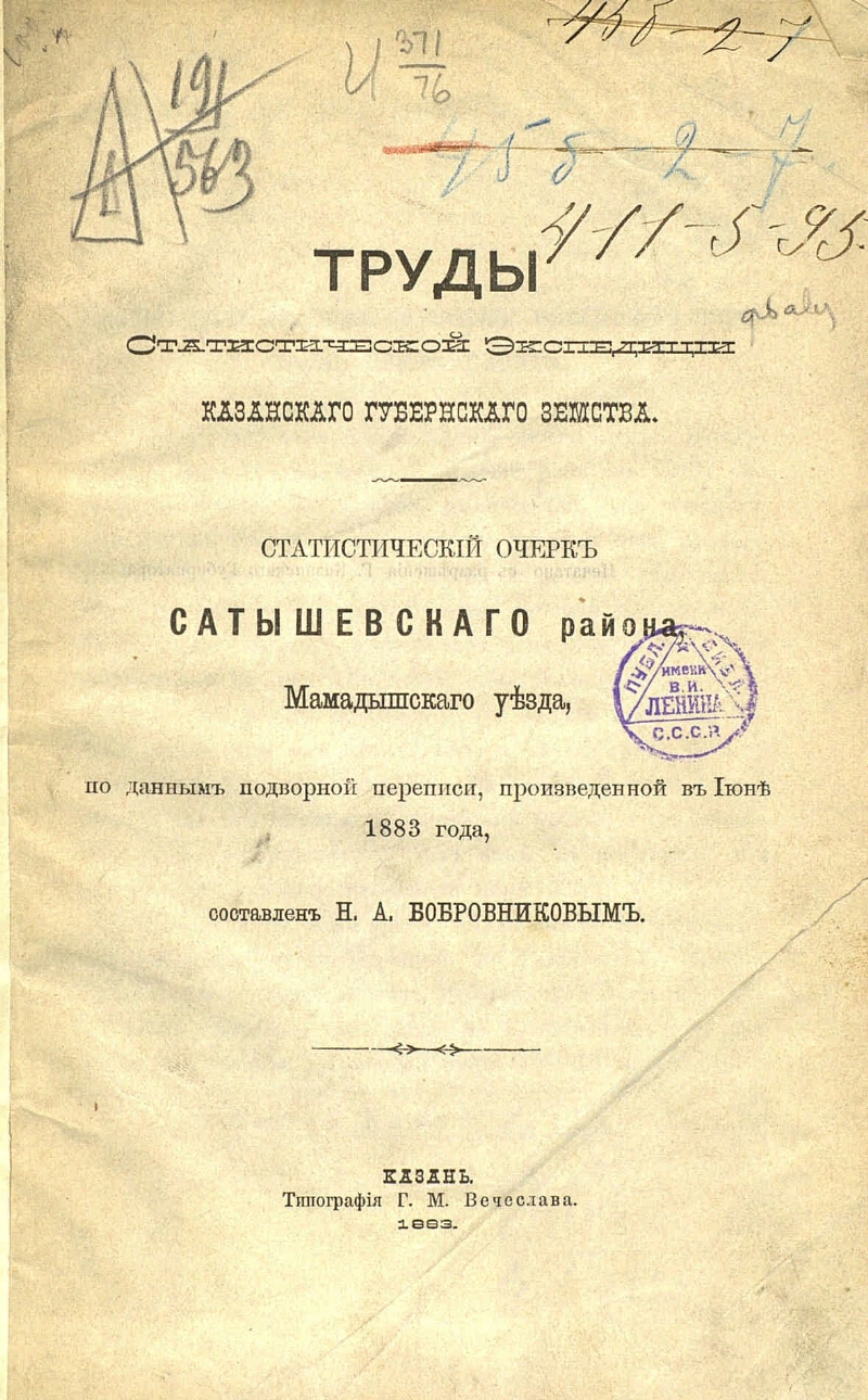 Статистический очерк Сатышевского района Мамадышского уезда по данным подворной переписи, произведенной в июне 1883 года / составлен Н. А. Бобровниковым. - Казань : тип. Г.М. Вечеслава, 1883. - [2], 47 с. ; 23 см. - (Труды Статистической экспедиции Казанского губернского земства)