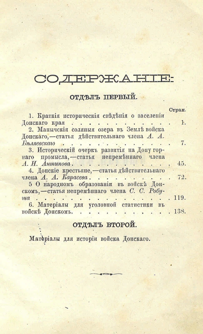 Вып. 1. - 1867. - Содерж: Краткие исторические сведения о заселении Донского края; Манычские соляные озера в Земле войска Донского / Беляевский А. А.; Исторический очерк развития на Дону горного промысла / Антипов А. И.; Донские крестьяне / Карасев А. А.; О народном образовании в войске Донском / Робуш С. С.; Материалы для уголовной статистики в войске Донском; Материалы для истории войска Донского