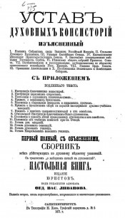 Устав духовных консисторий, изъясненный 1. Полным собранием свода законов Российской империи. 2. Статьями духовного регламента. 3. Указами святейшего Синода... : С прил. подлинного текста. 1. Инструкции благочинным белого духовенства. 2. Инструкции благочинным монастырей... : Первый полный с объясн. сборник действующих по Духовному ведомству узаконений : Настольная книга / Изд. юристов под ред. адвоката Фед. Вас. Ливанова. - Санкт-Петербург : тип. М. Хана, 1871. - XXVI, 192, [40], 31, [7] с. ; 25