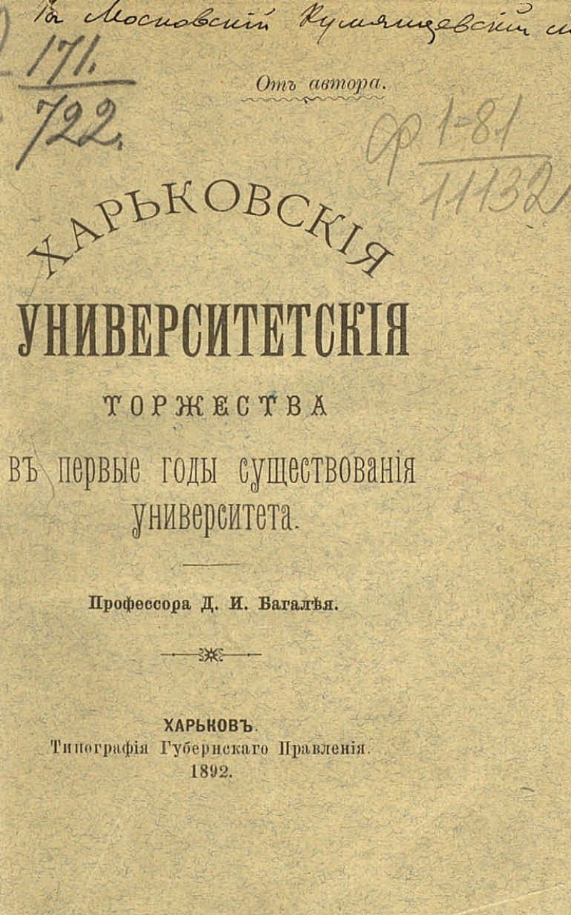 Автор Багалей Дмитрий Иванович Описание Багалей, Дмитрий Иванович (1857-1932). Харьковские университетские торжества в первые годы существования университета / [соч.] проф. Д. И. Багалея. - Харьков : Тип. Губ. правл., 1892. - 31 с. ; 16 см. - От автора Без тит. л. . ББК 74.58 Источник копии: РГБМесто хранения оригинала: РГБ Издательство тип. Губ. правл. Объект в каталогах Высшее образование. Педагогика высшей школы