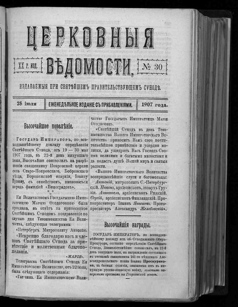 Церковные ведомости, издаваемые при Святейшем правительствующем Синоде : еженедельное издание с прибавлениями. - Санкт-Петербург, 1888-1918. - Выходит в 2-х частях: официальная и неофициальная. Неофициальная часть выходит под заглавием: Прибавления к Церковным ведомостям. За 1915-1916 гг. приложение к газете: Приходский листок. Заглавие: 1888-1917 № 8, 1918 № 1-3/4 Издаваемые при Святейшем правительствующем Синоде. Еженедельное издание с прибавлениями ; 1917 № 9/15-48/49 ... Еженедельное издание ; 1918 № 5-19/20 Издание православной русской церкви. Еженедельное издание с прибавлениями ; 1918 № 21/22 Издание православной русской церкви. Издание с прибавлениями ; 1918 № 23/24 Издание православной русской церкви. Издательство: 1918 № 1-3/4 Издательский совет при Святейшем Синоде ; 1918 № 5-23/24 Издательский совет при Священном Синоде. Приложения: Приходское чтение ; Определения Синода, молитвы, листовки, воззвания и т.п. : 101 брошюра. Алфавитно-предметный указатель к официальной части "Церковных ведомостей" за 1888-1897 годы : приложение к журналу. Санкт-Петербург, 1899. - Алфавитно-предметный указатель к официальной части "Церковных ведомостей" за 1898-1910 годы : приложение к журналу ... 1911, № 1-46. Санкт-Петербург, 1911.