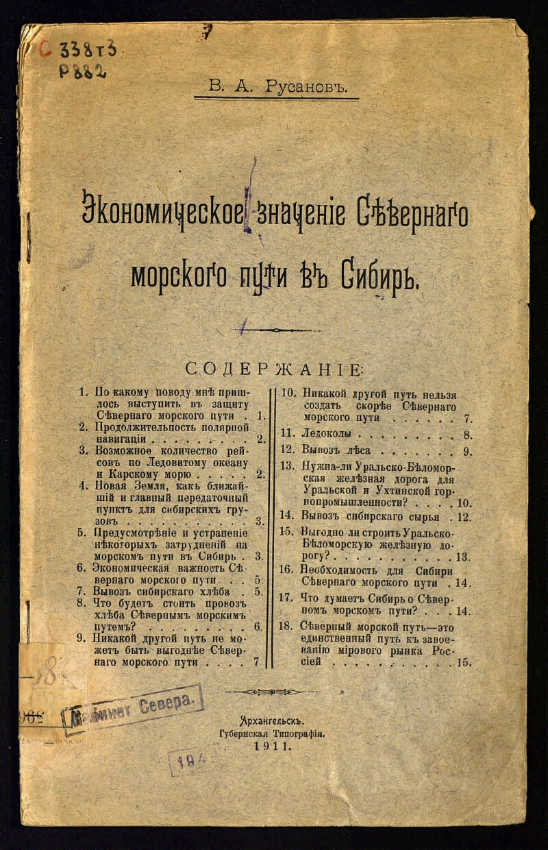 Экономическое значение Северного морского пути в Сибирь / В. А. Русанов. - Архангельск : Губернская типография, 1911. - [2], 15 с. ; 26 см. - Перепечатано из № 16 "Известия Архангельского общества изучения русского Севера" за 1911 г.