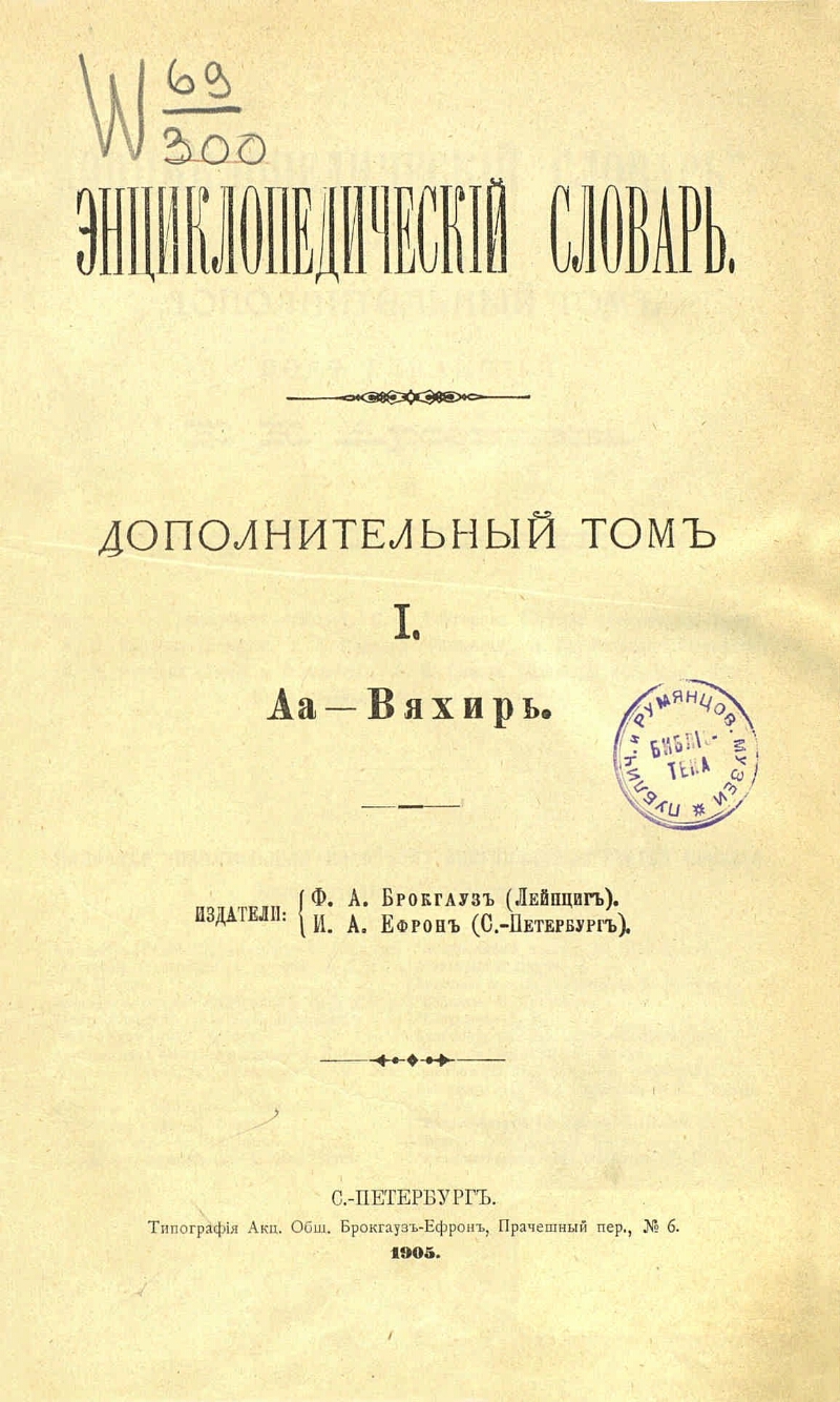 Энциклопедический словарь / издатели: Ф. А. Брокгауз, И. А. Ефрон ; [под редакцией профессора И. Е. Андреевского]. - Санкт-Петербург : типография Акционерного Общества Брокгауз-Ефрон, 1890-1907. - 24. - Издание выходило полутомами с последовательной нумерацией выпусков на корешках переплета. Редакторы: до буквы В: профессор И. Е. Андреевский; в последующих томах: К. К. Арсеньев и профессор Ф. Ф. Петрушевский; в дополнительных томах: К. К. Арсеньев и профессор В. Т. Шевяков. В Президентской библиотеке имеется электронная копия (РГБ).