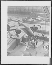 Lend-lease in action. American war planes, provided through lend-lease, are in action on the various fighting fronts. Lend-lease twin engine bombers are shown being hoisted aboard ship in an unnamed American port from a lighter alongside. They are bound for distant Allied ports. More bombers in the background are awaiting loading. Expert welders fasten the big planes securely to the ship's deck to protect shipments from damage during heavy weather [Graphic] . - 1943 Feb. - 1 negative : safety ; 5 x 7 inches or smaller. - Title and other information from caption card. - Actual size of negative is C (approximately 4 x 5 inches)