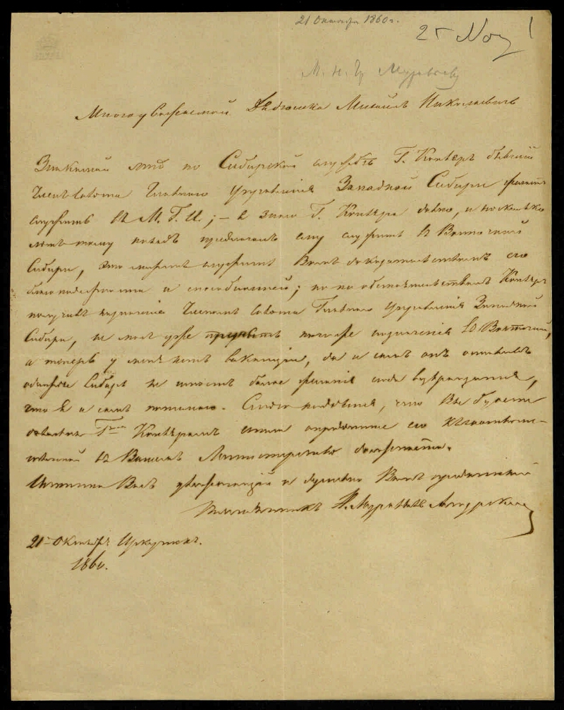 | Примечания | Заголовок дела на папке: Письмо Муравьева-Амурского Николая Николаевича (племянника) Муравьеву М. Н. Лист 1 - тиснение короны с надписью "ВАТН" Рукописный текст. Чернила |
