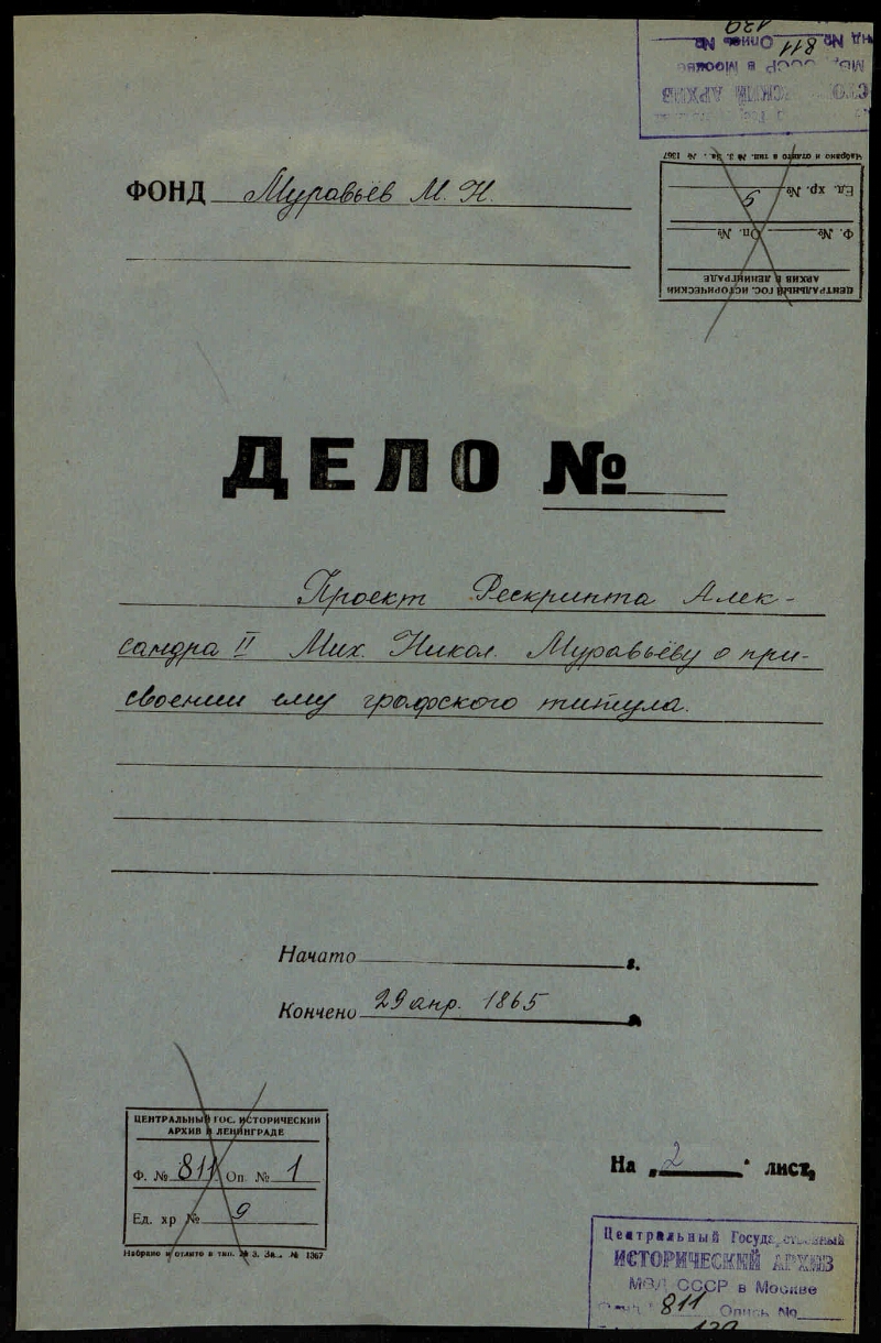 | Заголовок | Проект рескрипта Александра II М. Н. Муравьеву с присвоением ему графского титула |
